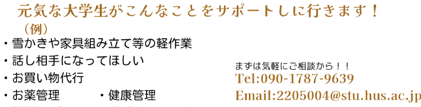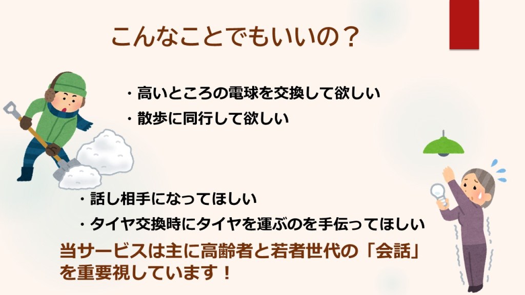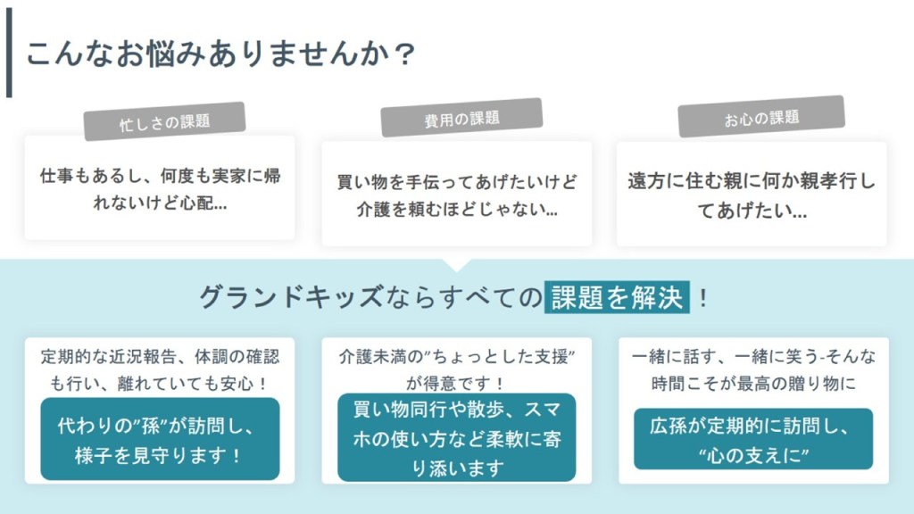 元気な大学生世代が高齢者の自宅へ話し相手や介護サービスでは行き届かない包括的サポートをし、依頼者へ報告することがサービスの主体となっています